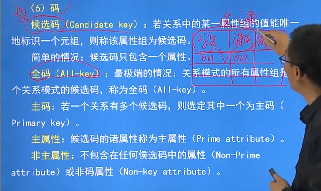 所有属性组(全部属性的集合)都是这个关系模式的候选码 所有的属性加起来才能成为候选码(不能说每一个都能成 比如学生选课 必须学号加上课号才能确定一个元组)