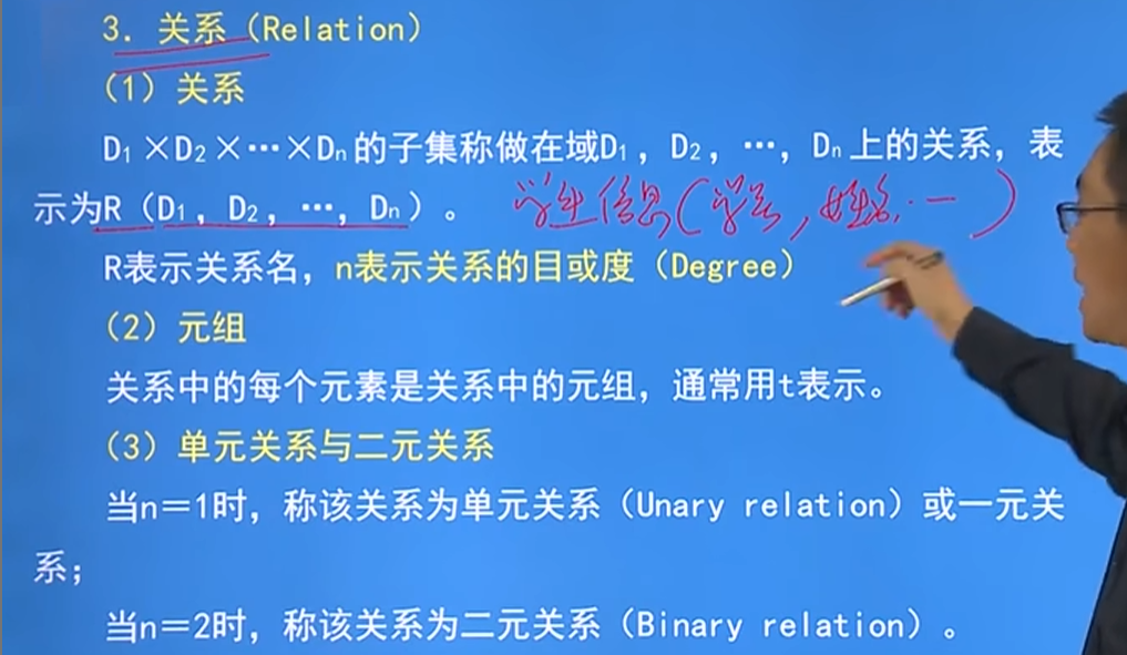 R表示关系名 就比如下面学生信息就是关系名 里面D就是属性 属性个数是关系的目或度