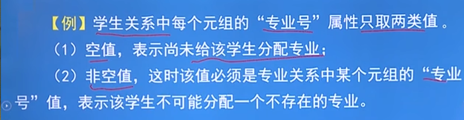 若属性A是基本关系R的主属性,则属性A不能取空值(空值就是不知道 不存在 或无意义的值)比如身份证号