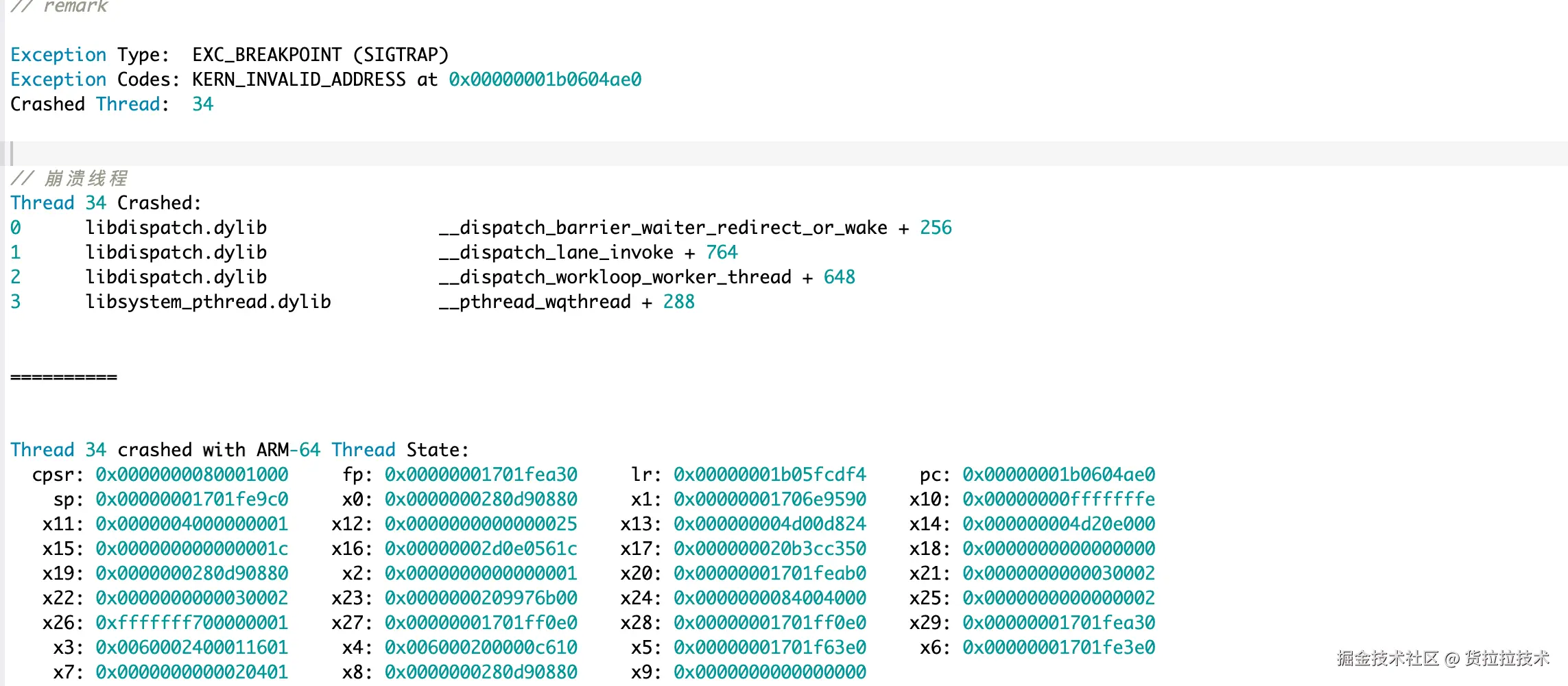GCD(libdispatch)等系统库在检测到内部状态异常(如队列死锁、资源竞争)时可能触发SIGTRAP,比如dispatch_group_t的enter/leave不匹配。