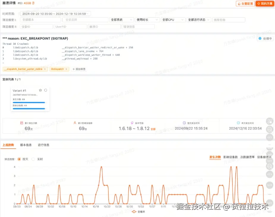 因为崩溃类型是EXC_BREAKPOINT (SIGTRAP)类型, 并且发生在 libdispatch.dylib(即 GCD,Grand Central Dispatch)内部函数中。