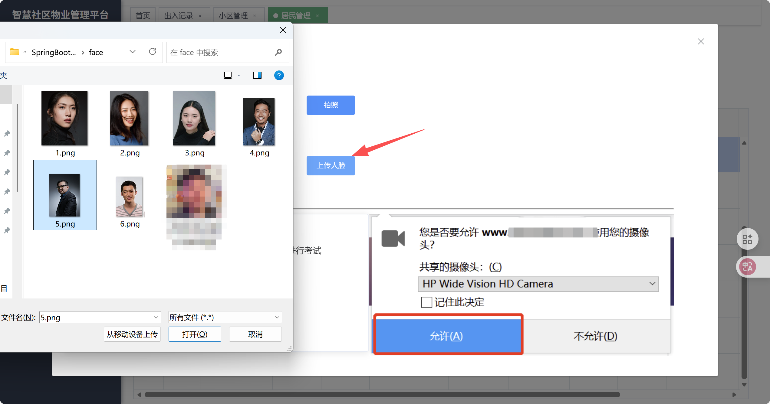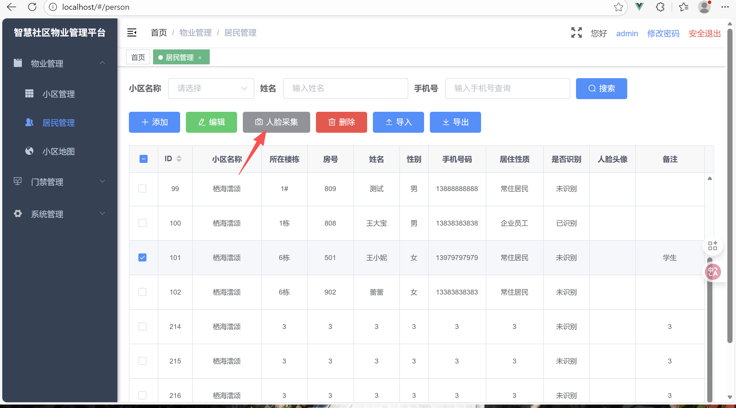 首先居民需要录入自己的人脸,在采集人脸中录入,随后人脸图片进入腾讯云的人员库和服务器的数据库。