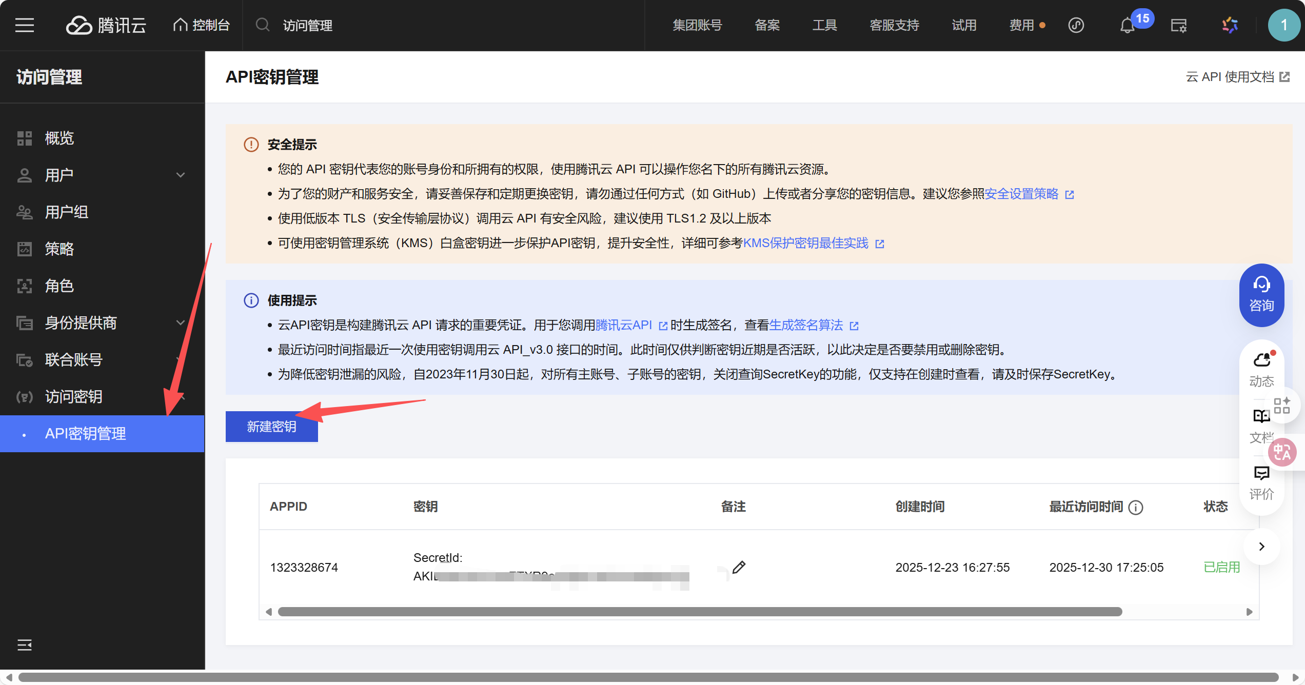 新建密钥后记得保存密钥,key一旦创建完成,就不会再显示。