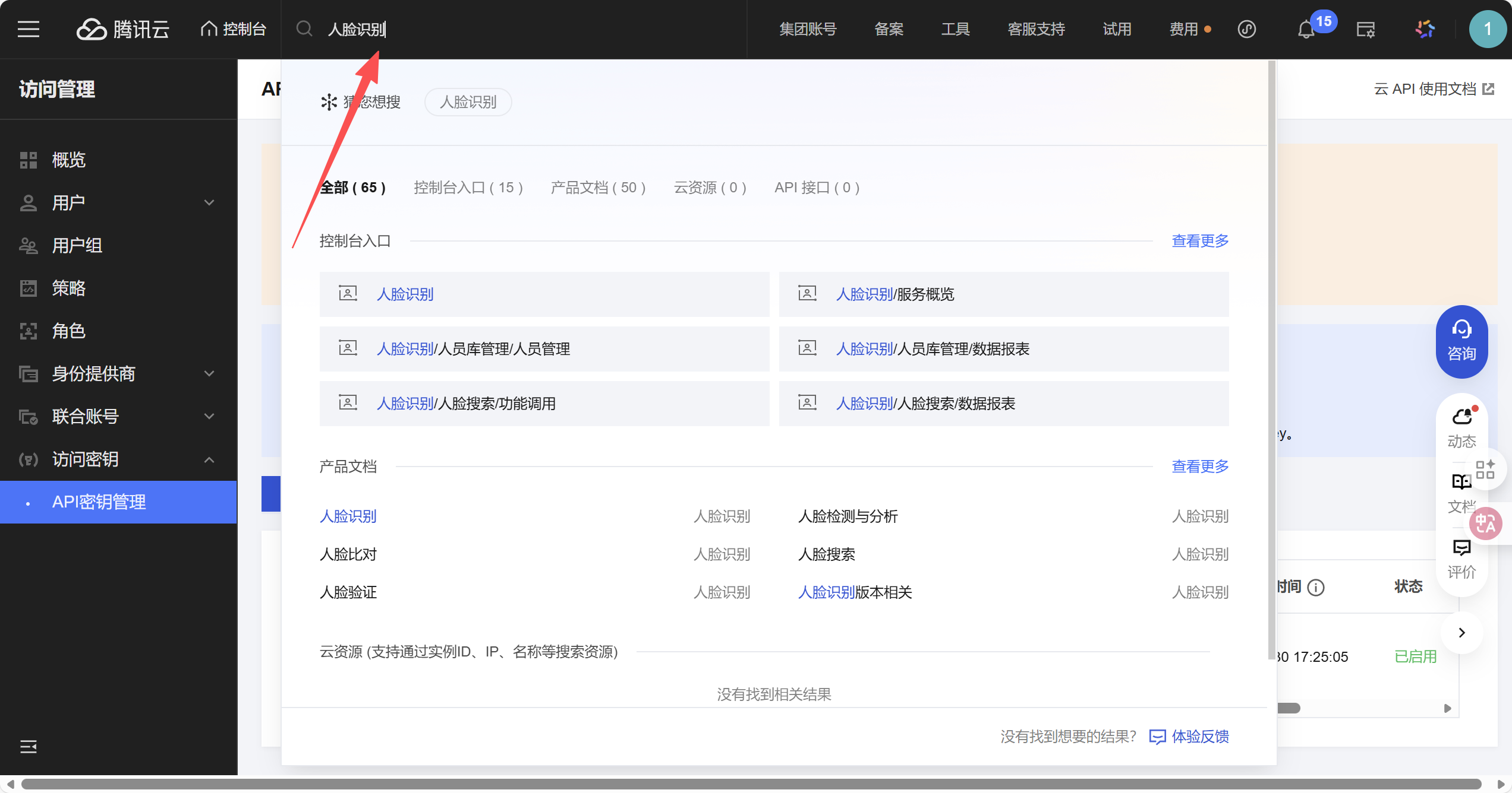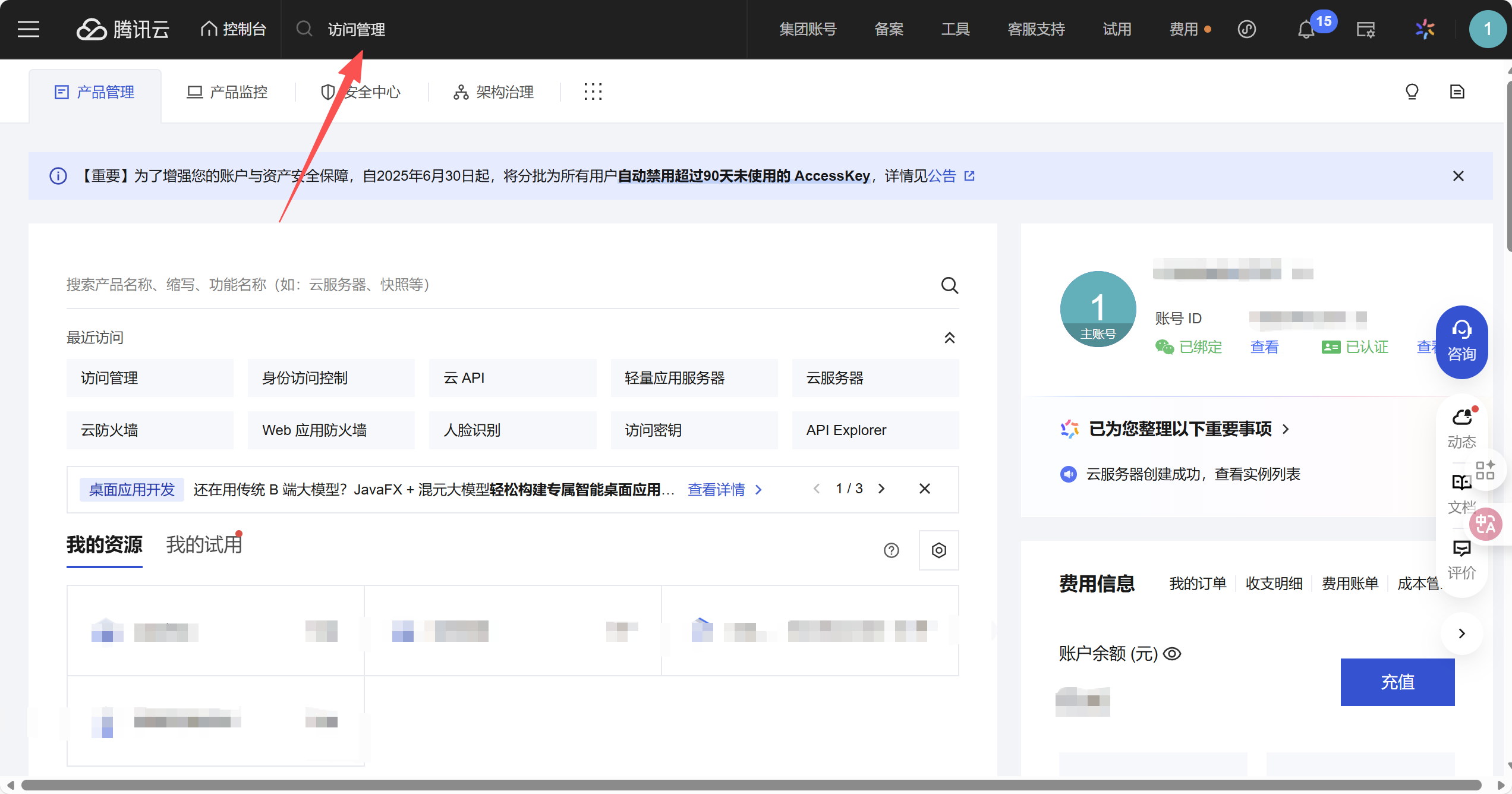 首先进入控制台总览,然后搜索访问管理: