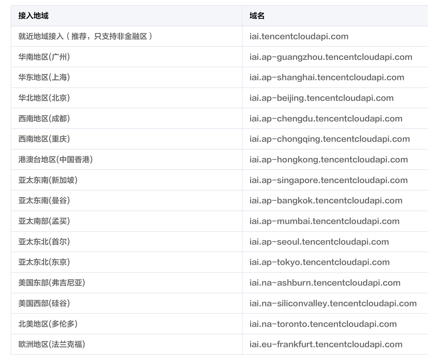 server-ip:域名是 API 的接入点,并不代表产品或者接口实际提供服务的地域,接口支持的地域如下: