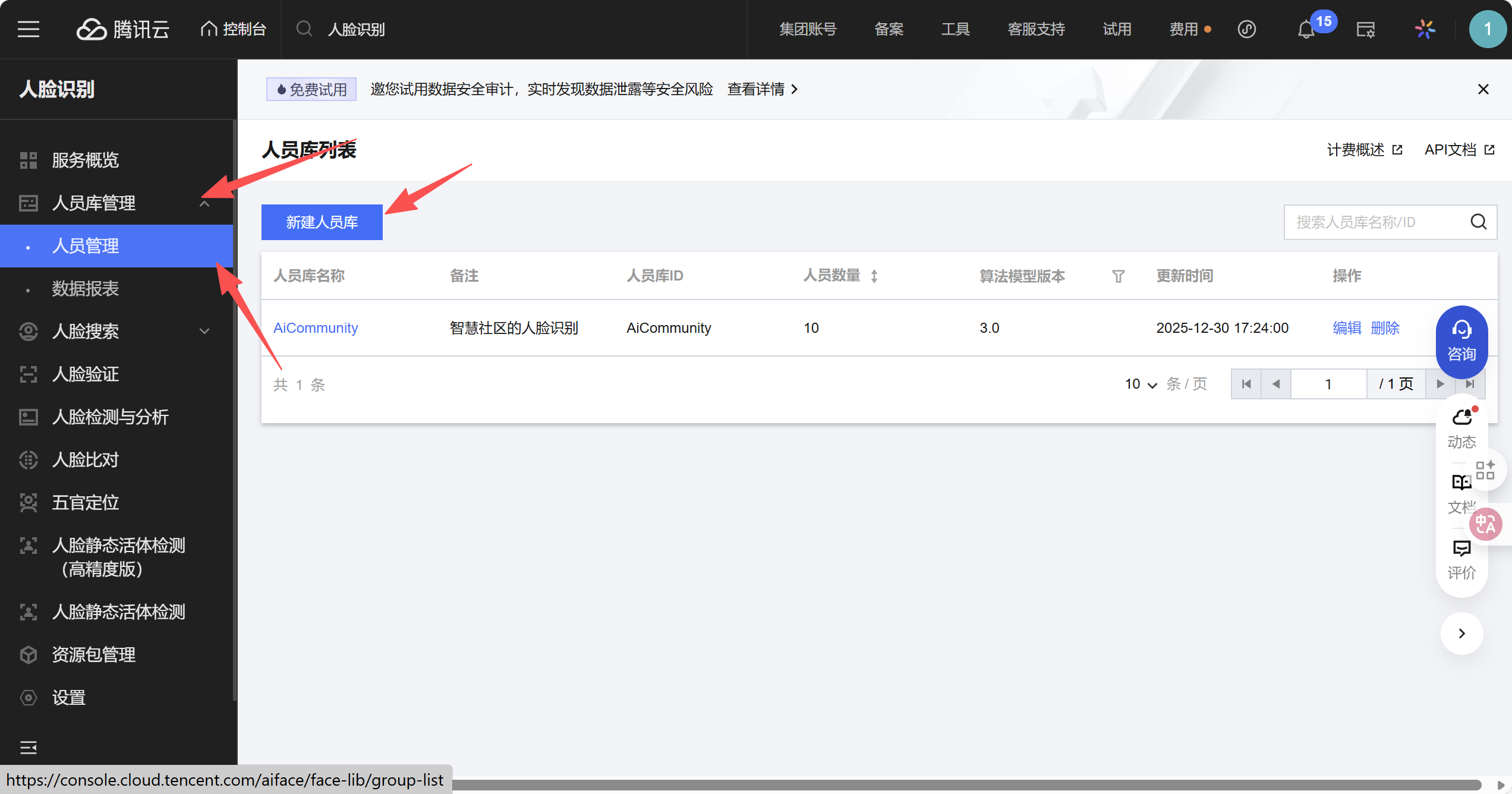 按照要求填写必填项,其中人员库id需要配置在配置文件当中