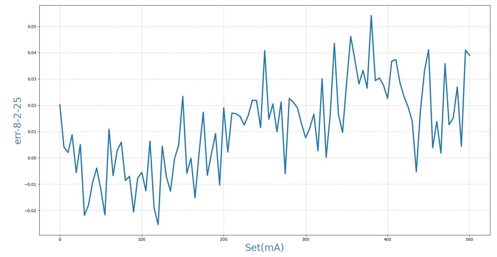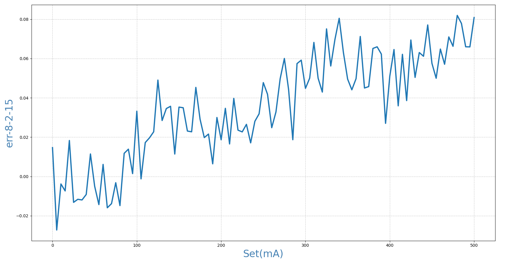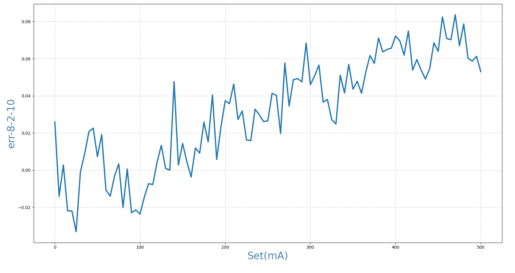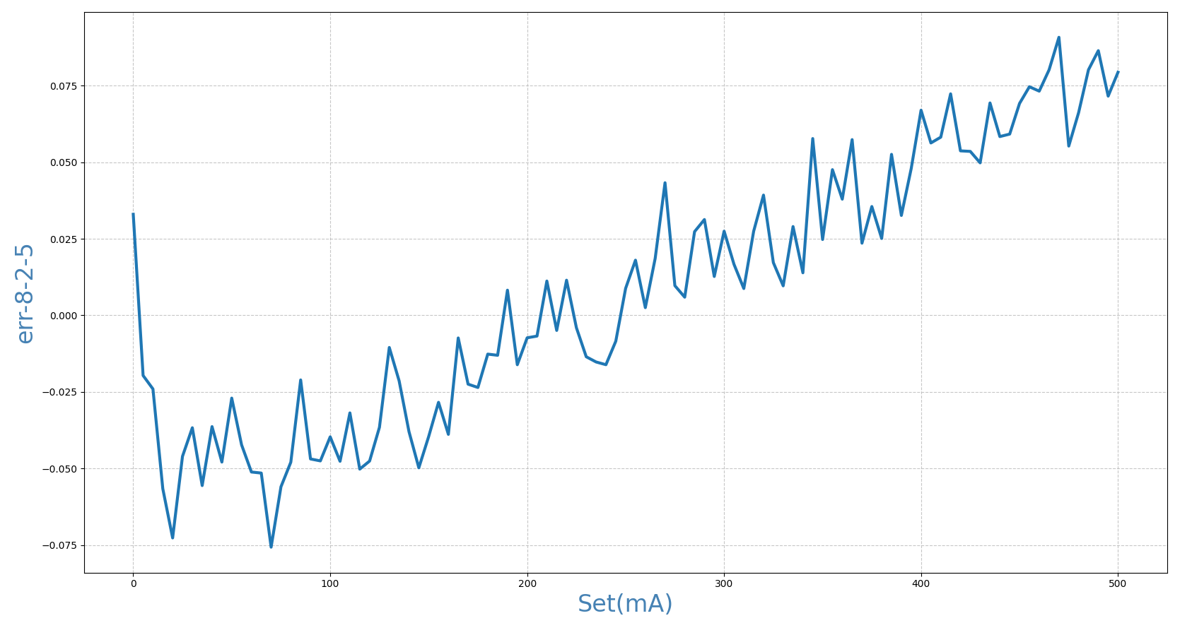 在昨日的测试中,我们对数据进行了初步汇总与分析。基于昨日测试结果,今日我们进一步开展更为细致的评测工作。本次测试将温度增量设定为 5℃,继续采用全量程扫描测试方法。误差定义保持不变,仍为电流输出误差 = 设定值 - DM3068 示值(单位:mA)。