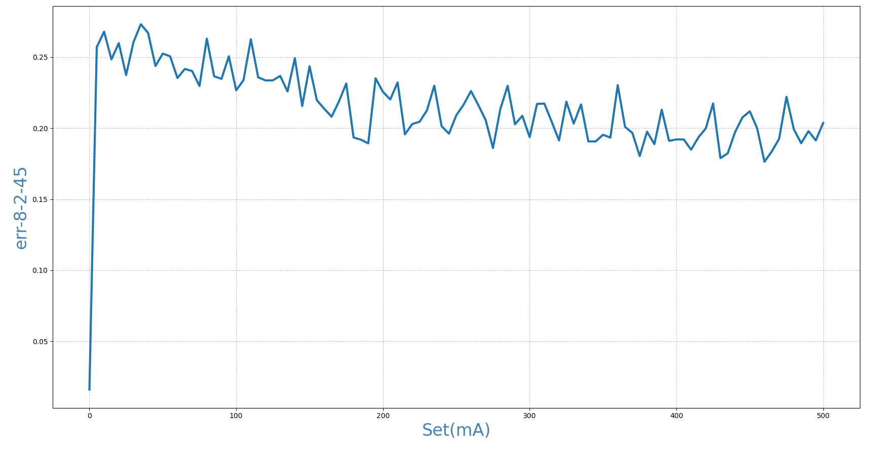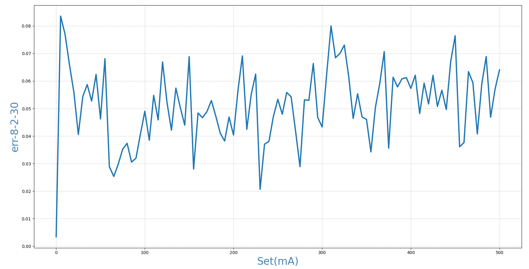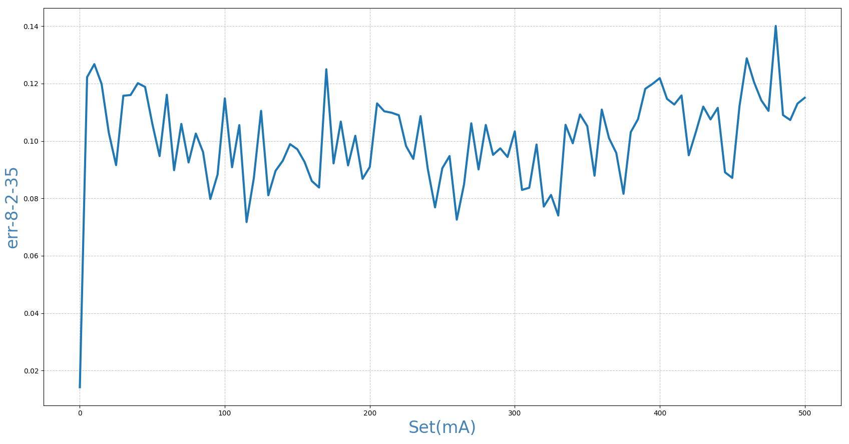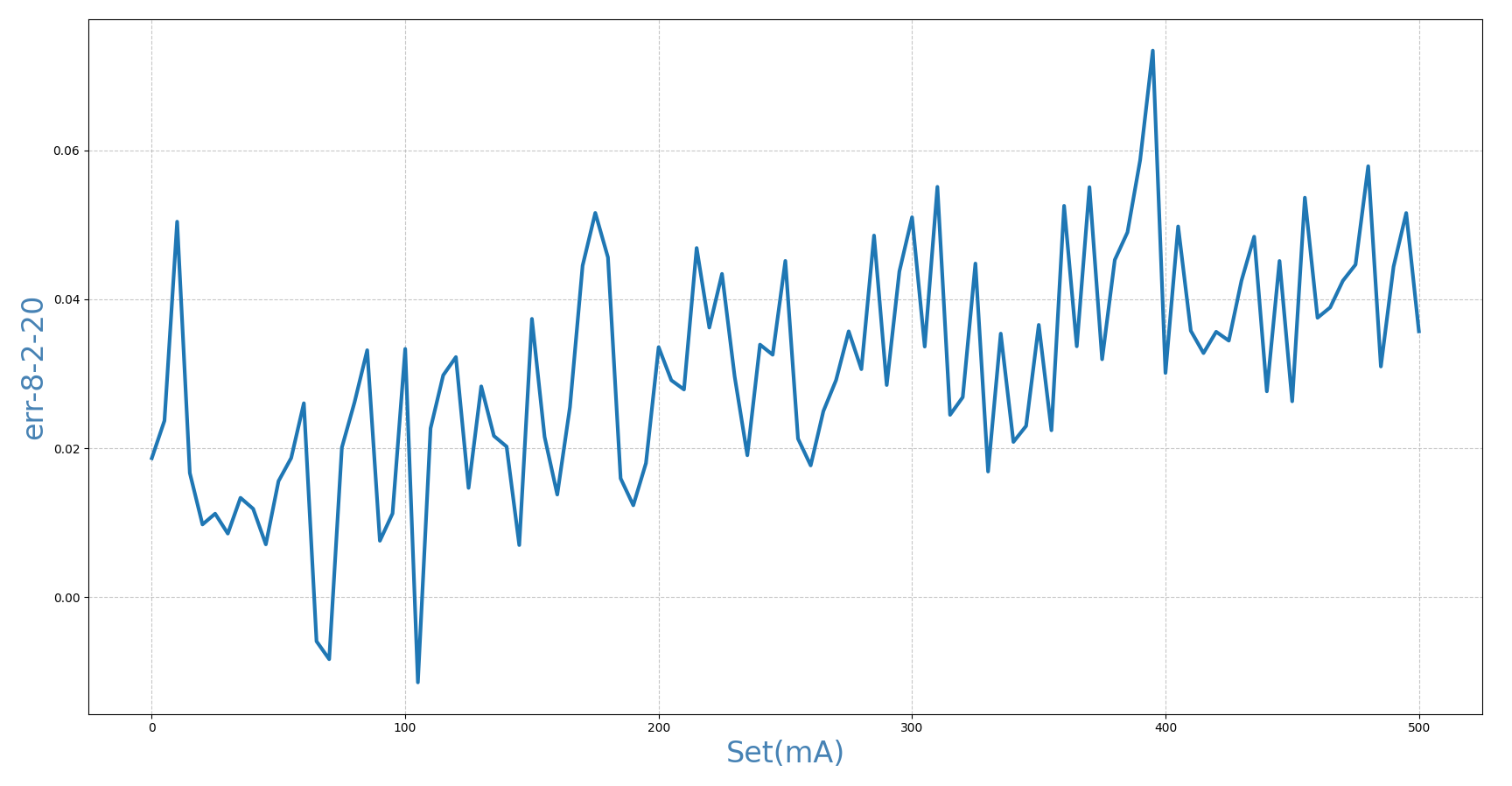 在昨日的测试中,我们对数据进行了初步汇总与分析。基于昨日测试结果,今日我们进一步开展更为细致的评测工作。本次测试将温度增量设定为 5℃,继续采用全量程扫描测试方法。误差定义保持不变,仍为电流输出误差 = 设定值 - DM3068 示值(单位:mA)。