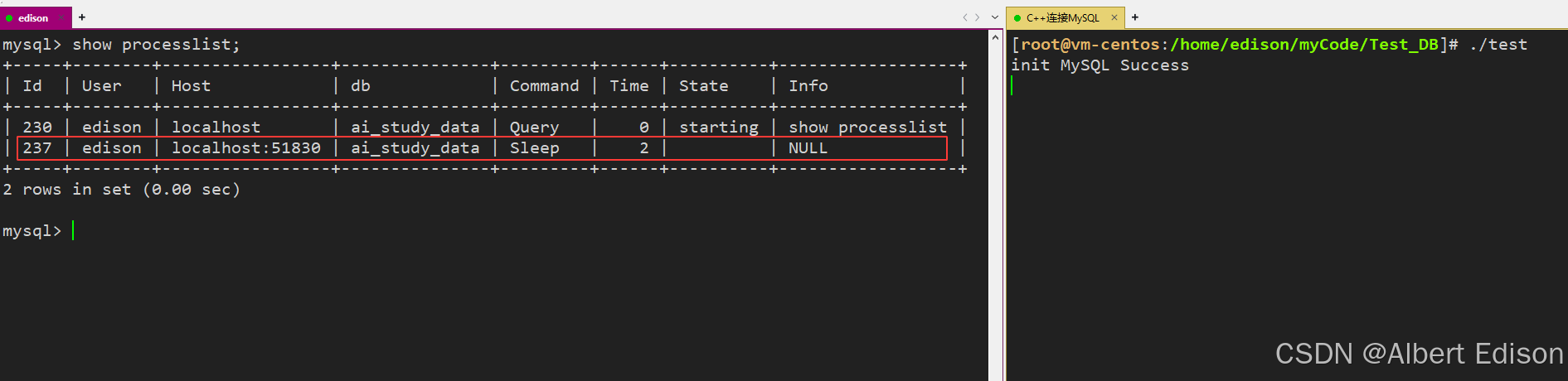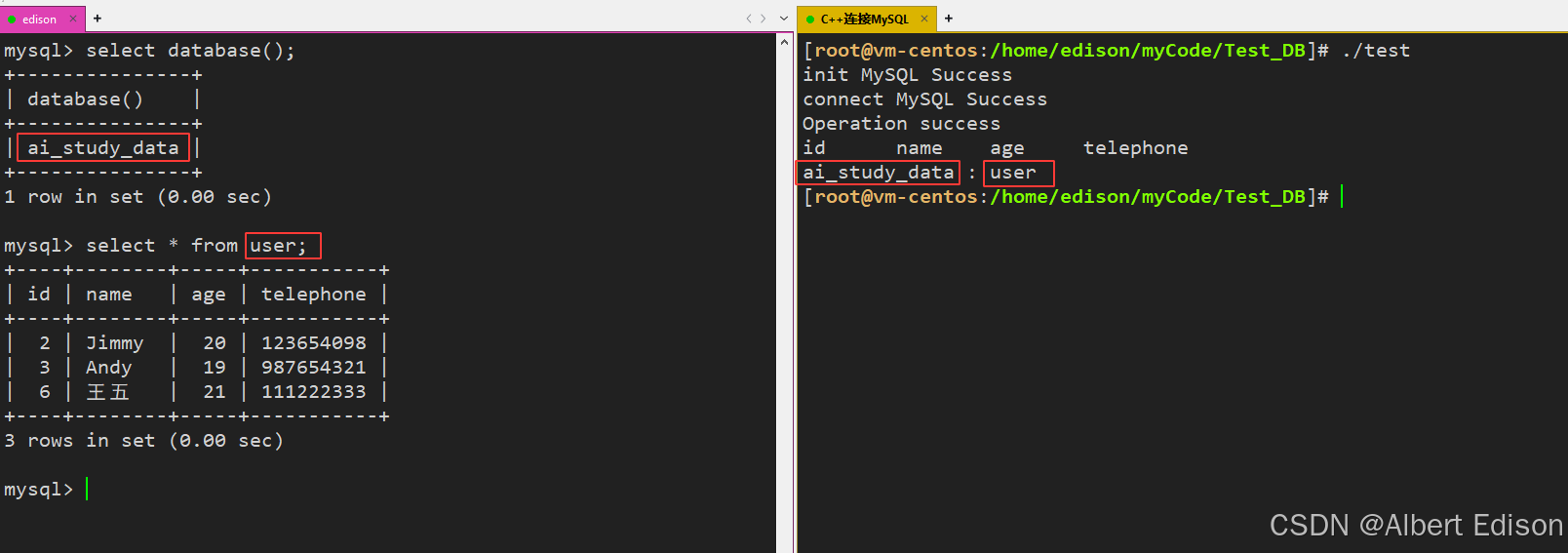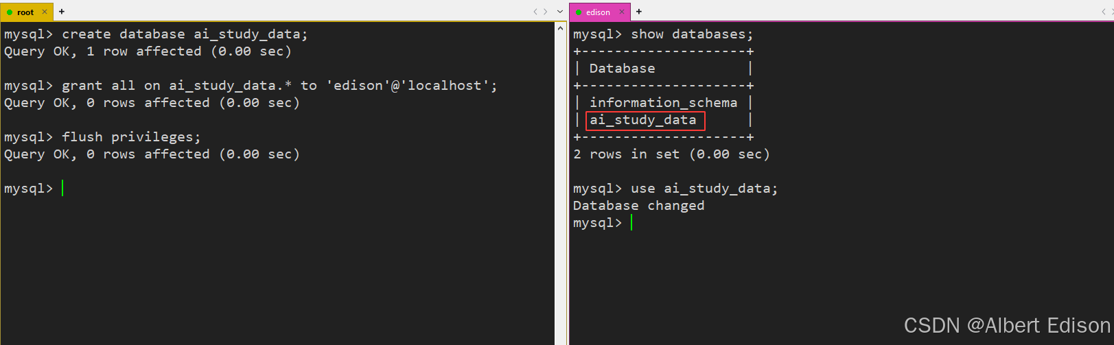 然后创建一个名为 ai_study_data 的数据库,并赋予 edison 用户对该数据库的所有权限:
