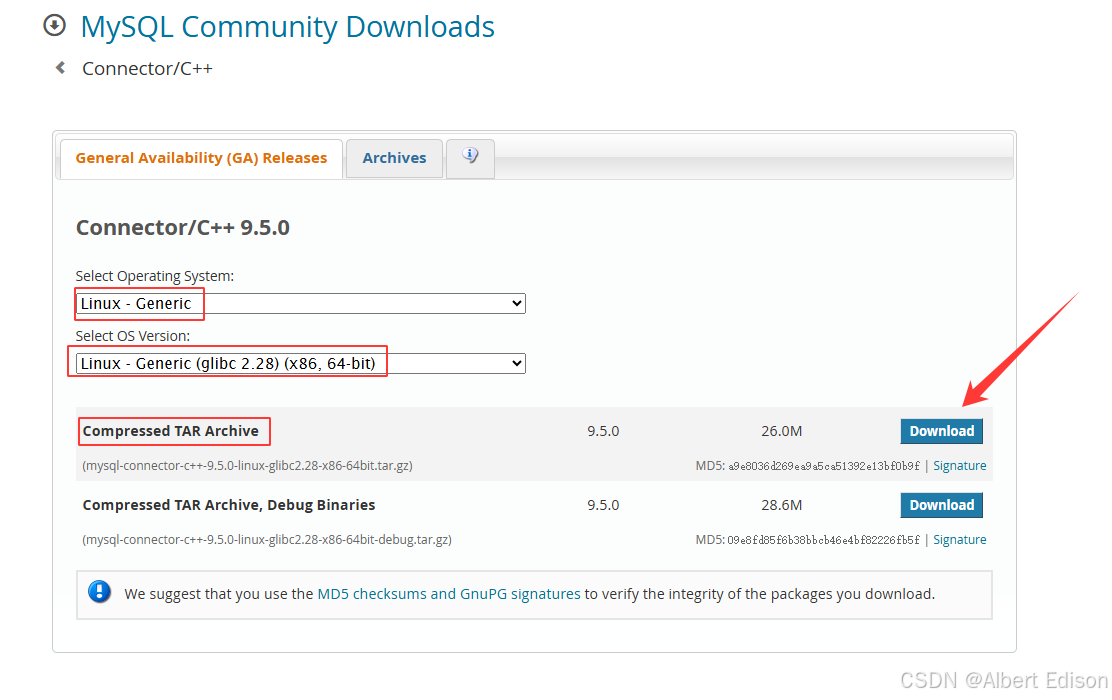 选择默认的 Connector/C++ 9.5.0 下载即可。
