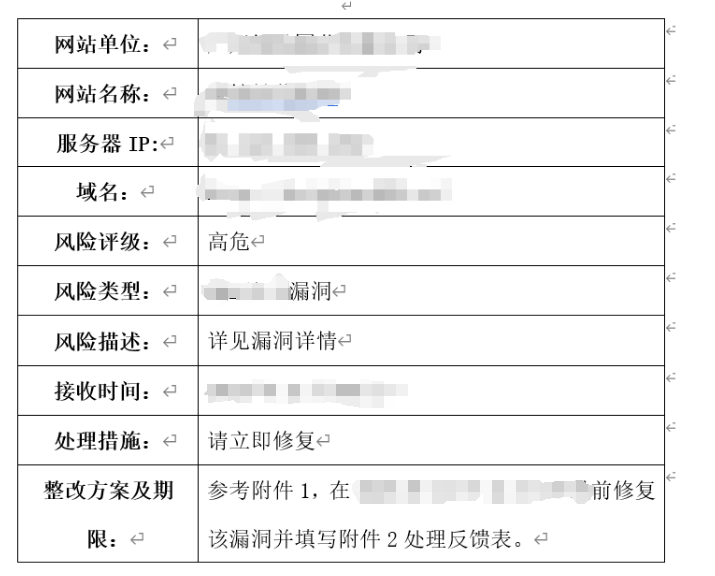 首先是要下发漏洞整改通知书要包括单位、名称、IP、域名等,如下图所示,详情内容就和渗透测试报告里或者攻防报告里。把成果填进去。再写上如何整改就可以了。
