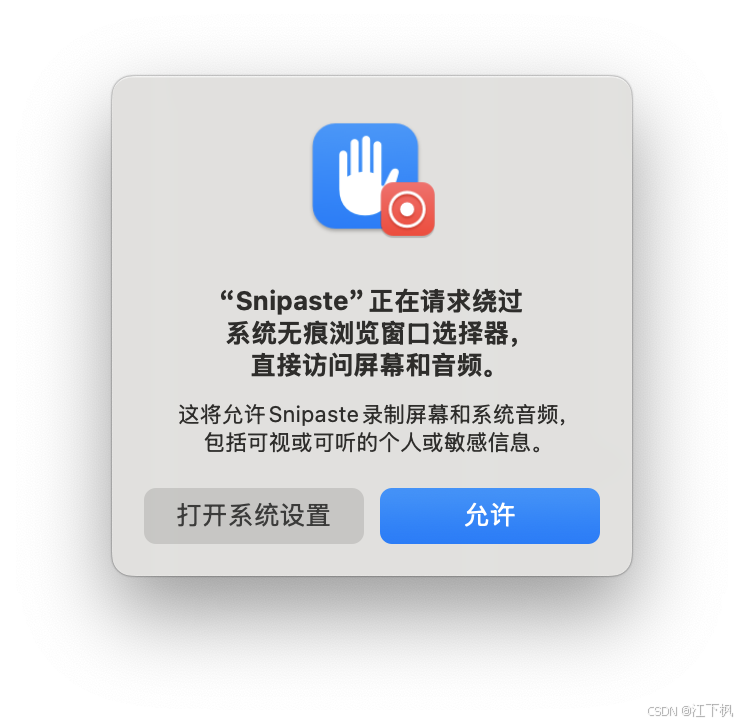 当应用首次使用特定服务(多数与隐私相关,例如摄像头、麦克风、磁盘访问等),会弹框提示用户,是否同意授权。Android 6.0 新增的动态权限其实就是类似于苹果的 TCC。例如,macOS 三方截屏软件向直接截屏时,会提示用户,是否允许。