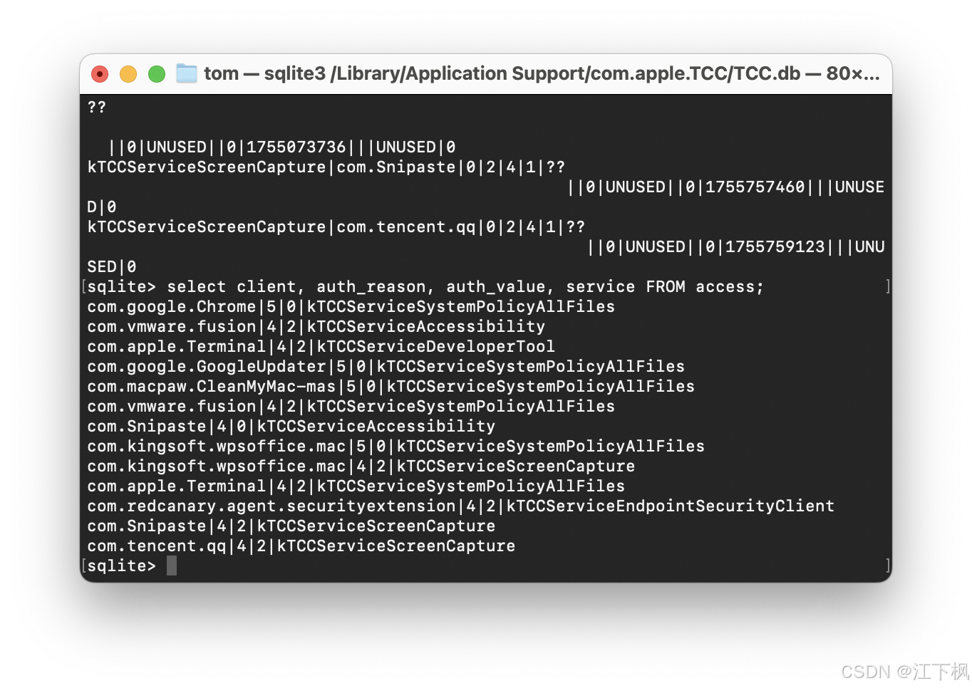 TCC 配置信息存储在 TCC.db 数据库中,可以通过 sqlite3 命令查看内容,例如