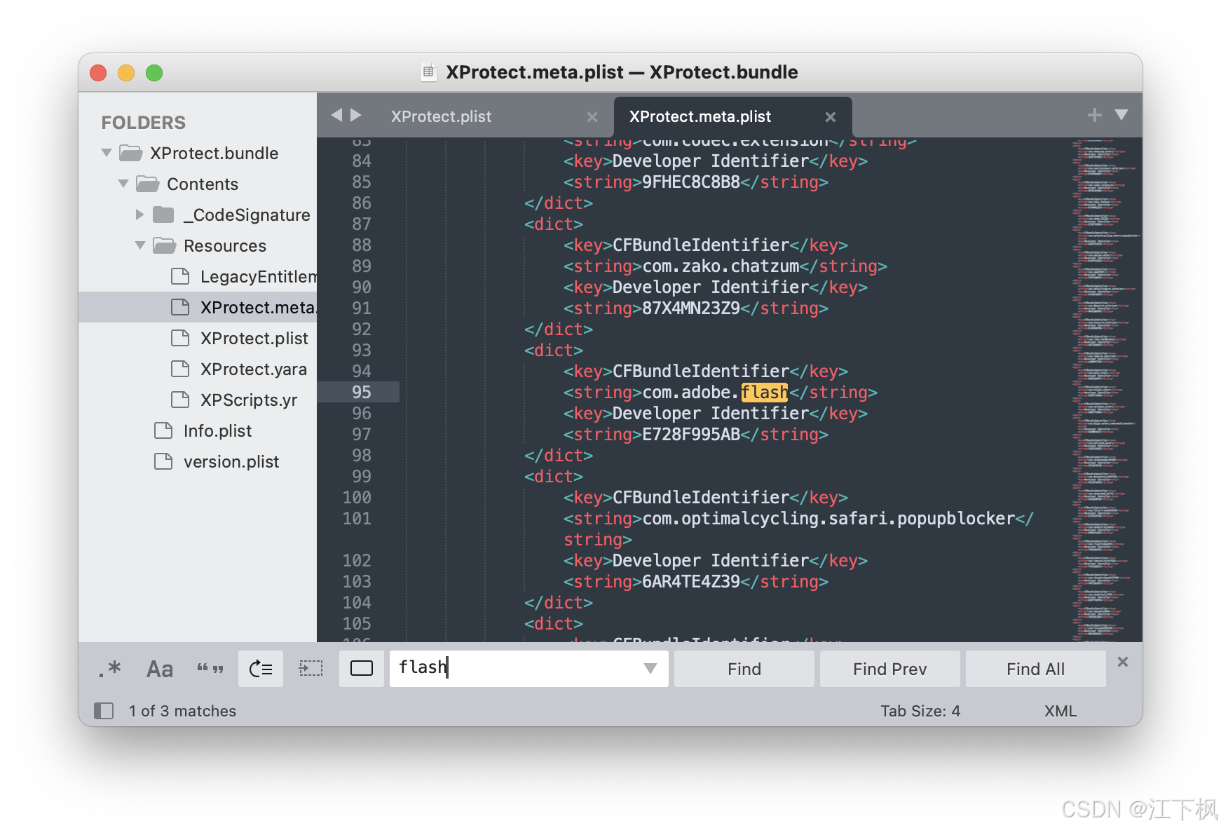 这是最原始的 XProtect 检测规则,包含一些过时的软件,如 Java 和 Flash。如今,此文件最主要的目的是防止恶意 Safari 扩展程序。通过 bundle identifier 和 developer identifier 进行识别。