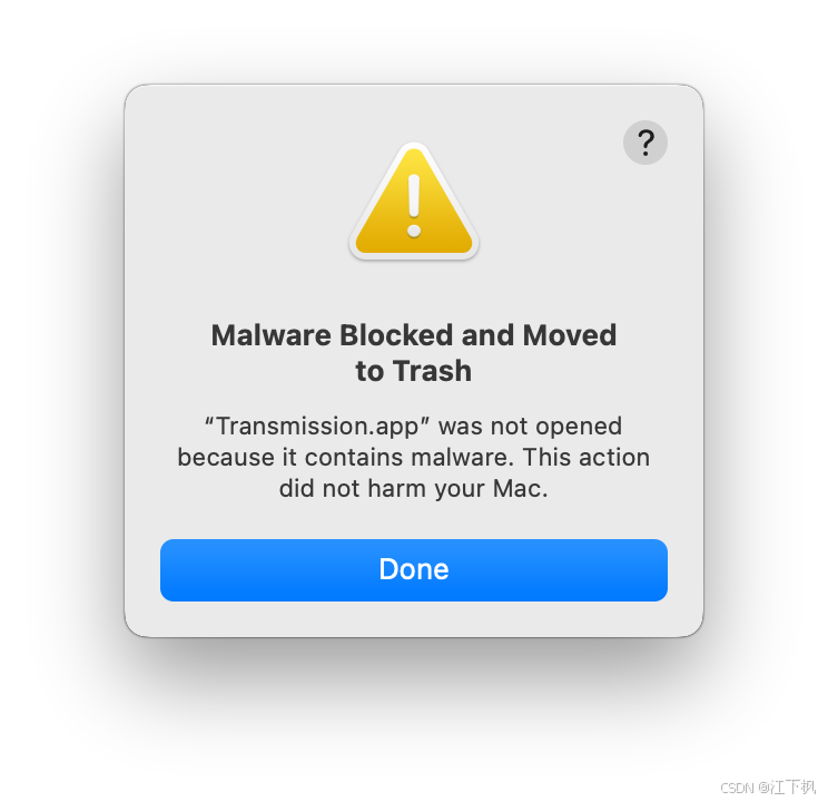 当我实际打开这个文件 Transmission-2.90.dmg 时,macOS 的确会弹框报毒,但是实际在此二进制中并没有找到特征序列。