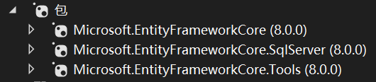 - 根据VS版本安装对应版本的NuGet程序包,三个程序包,分别为:Microsoft.EntityFrameworkCore、Microsoft.EntityFrameworkCore.SqlServer、Microsoft.EntityFrameworkCore.Tools
