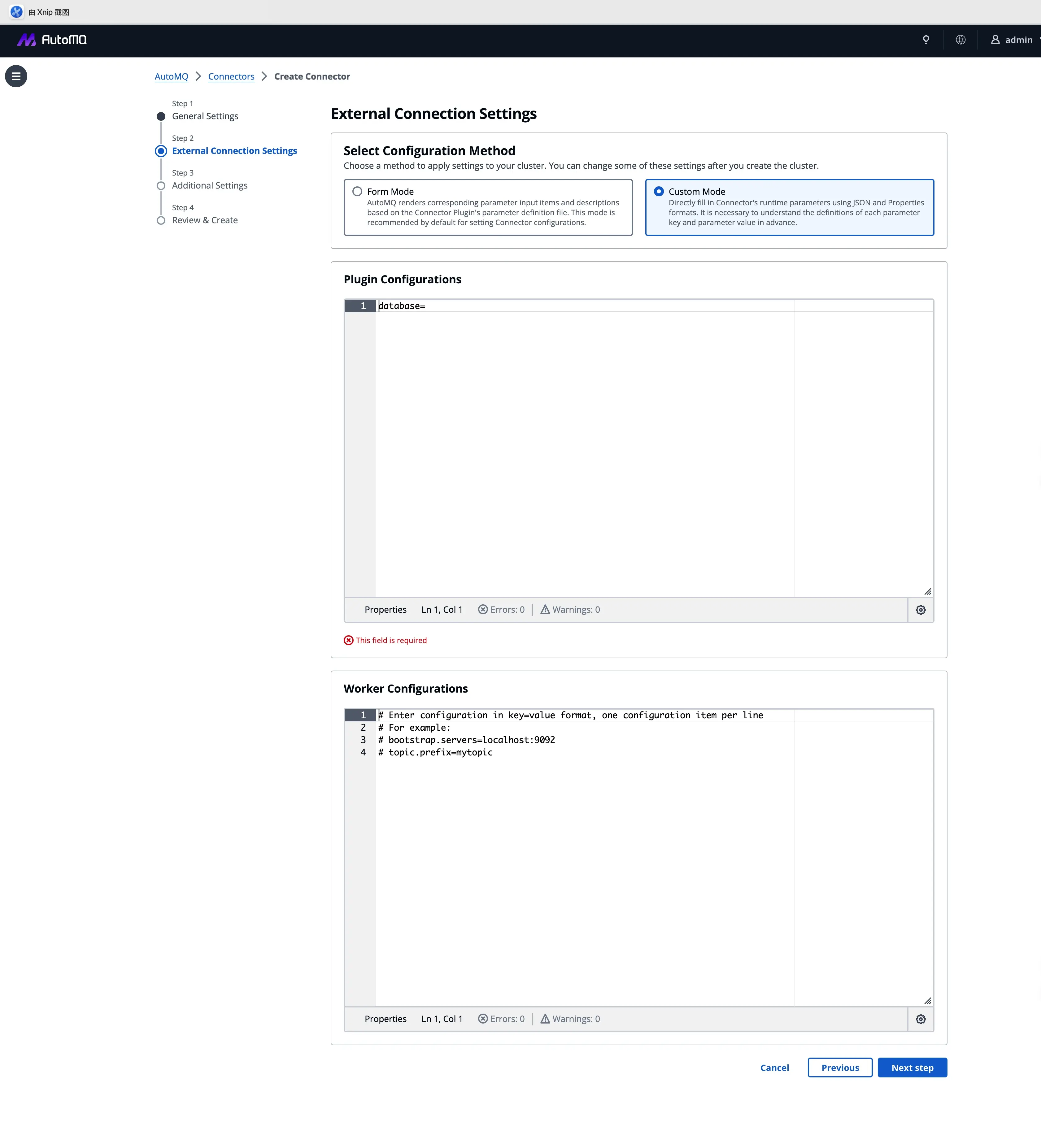 - 自定义模式:针对 Debezium 等复杂场景,支持直接粘贴 JSON/Properties,确保存量业务的平滑迁移。