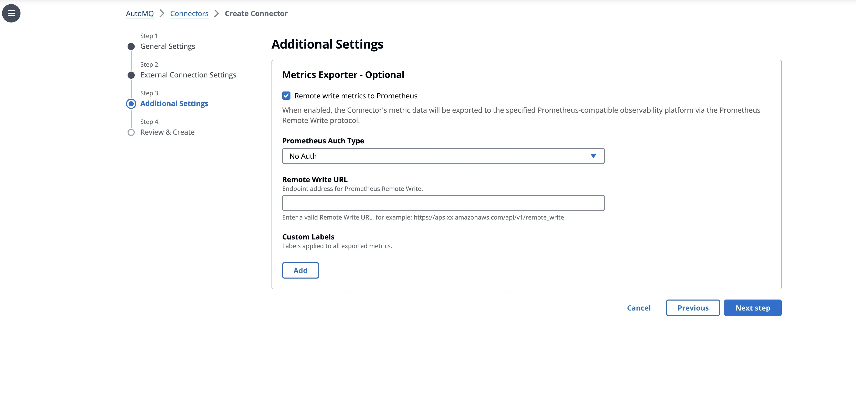 在"额外设置"中,我们内置了标准化的可观测性集成。通过勾选 Remote Write,Connector 的监控指标可直接对接到 Prometheus/Grafana 体系,无需额外部署 Exporter,彻底告别黑盒运维。