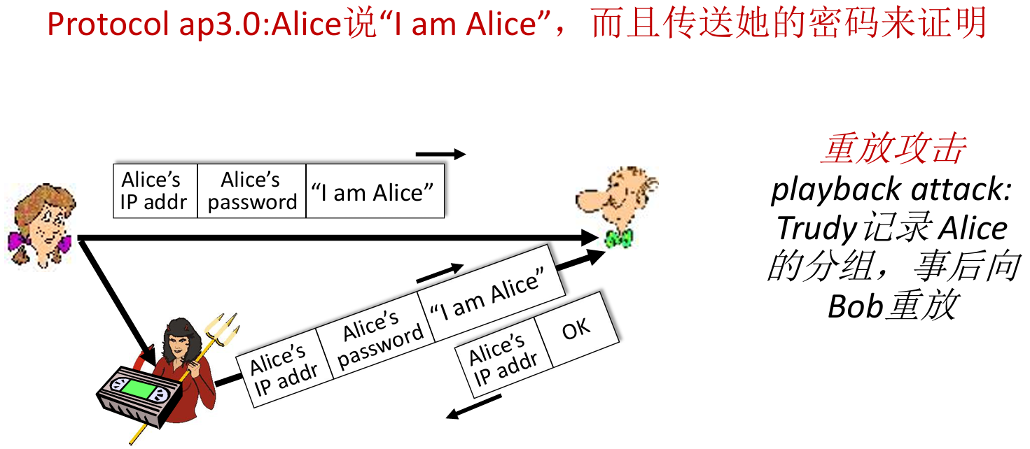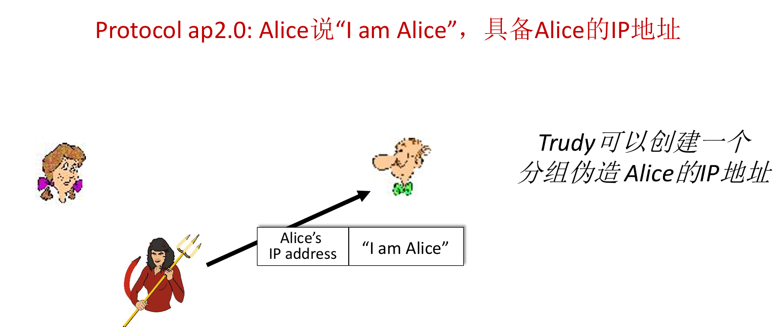 - 漏洞 :Trudy可轻易伪装成Alice,无任何验证机制。