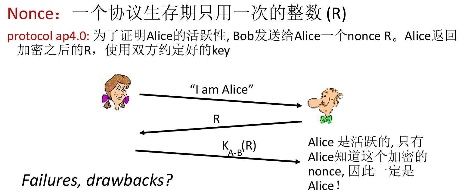 - 协议ap4.0 :Alice声明身份并传输加密的nonce(随机数)
