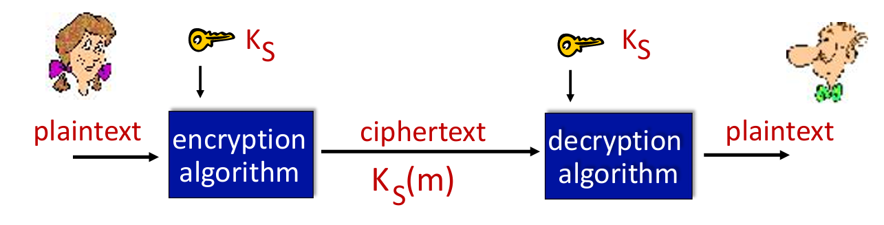 - 对称秘钥系统 (symmetric key system):Alice和Bob的秘钥是相同,且密钥是保密。