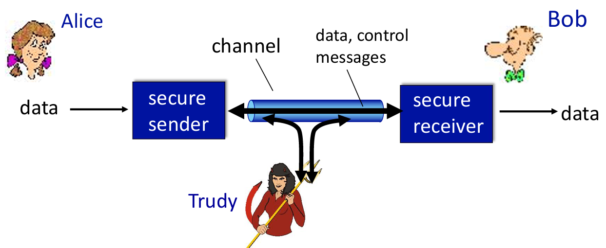 - 身份认证(Authentication)目标:Bob需要确认Alice的身份,确保通信对方是合法实体而非攻击者(如Trudy)。