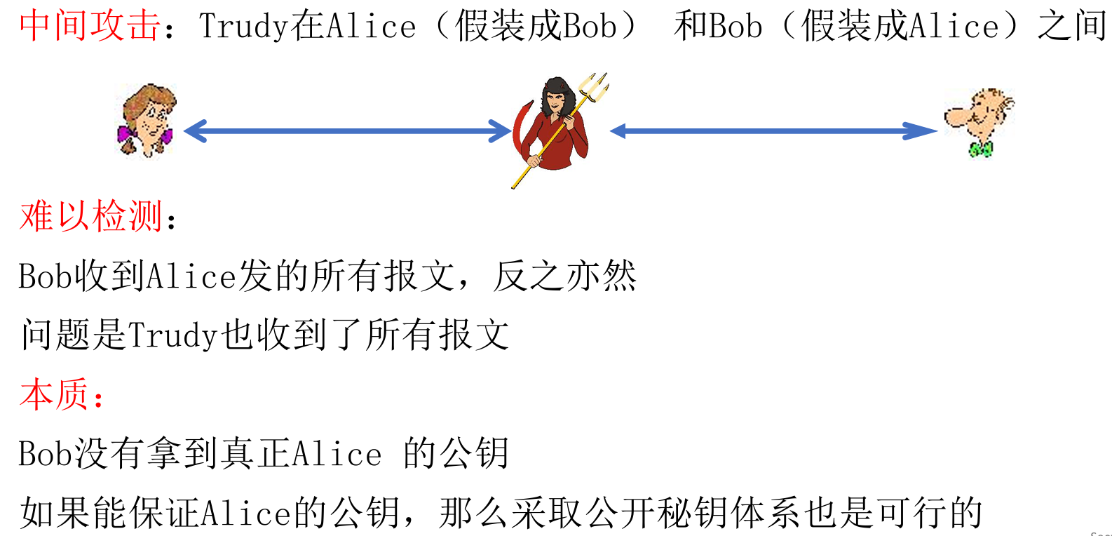 - 漏洞 :中间人攻击 (Trudy拦截并冒充Alice/Bob)。