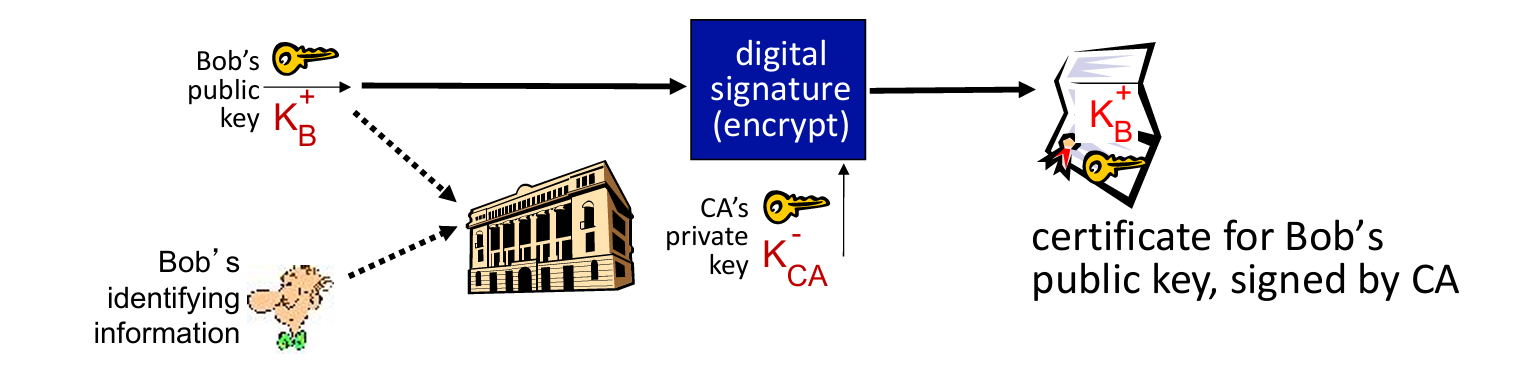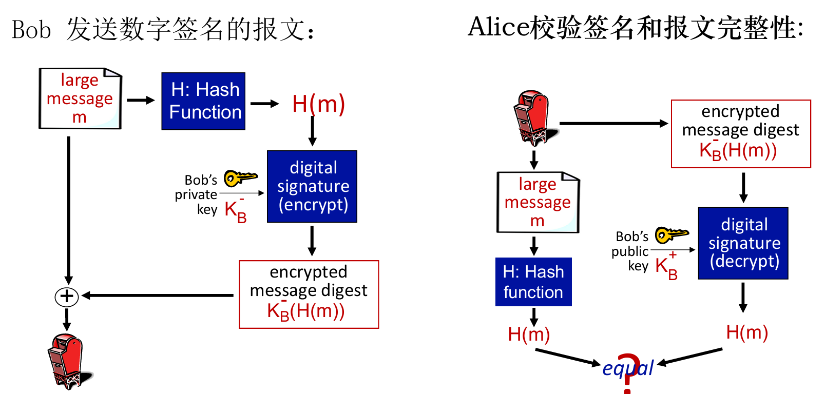 - Alice用Bob公钥 K B + K_B+ KB+ 验证: K B + ( K B − ( H ( m ) ) ) = H ( m ) K_B+(K_B-(H(m))) = H(m) KB+(KB−(H(m)))=H(m)。
