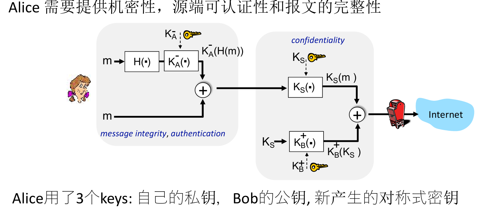 - 机密性 :用对称密钥 K S K_S KS 加密报文,用Bob公钥加密 K S K_S KS。