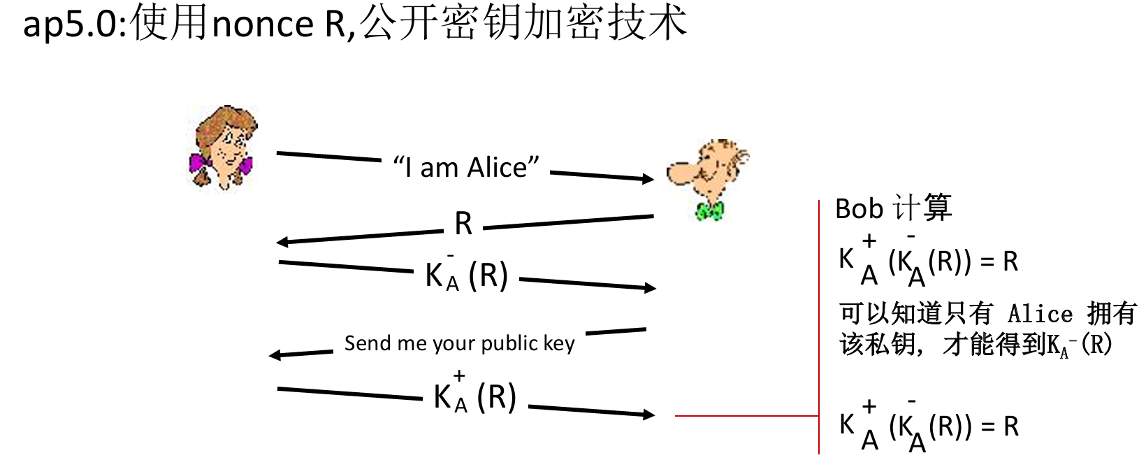 - 原理 :Bob发送nonce R R R,Alice用共享密钥 K A − B K_A-B KA−B 加密返回 K A − B ( R ) K_A-B(R) KA−B(R)。