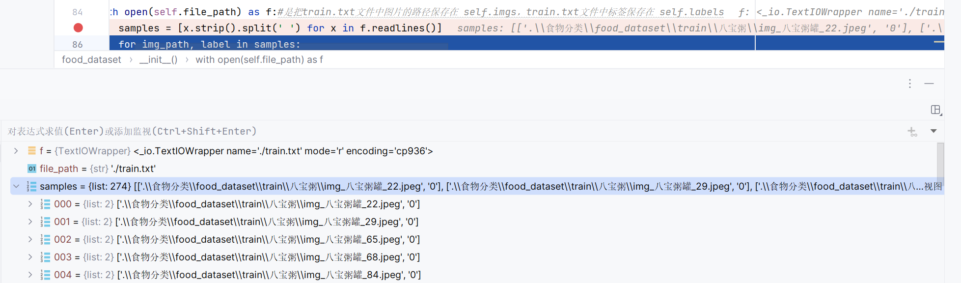 创建子类继承Datasetj处理图片数据,初始化过程中通过samples = [x.strip().split(' ') for x in f.readlines()]和下面的循环结构获取存储图片位置的列表和标签的列表。.strip()去除字符串两头的空格以及换行符。.split(' ')以空格分隔字符串。执行效果: