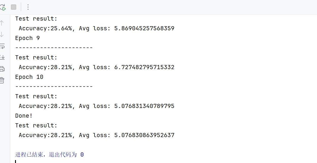 print(f"Test result:\n Accuracy:{(100 * correct):.2f}%, Avg loss: {test_loss}")