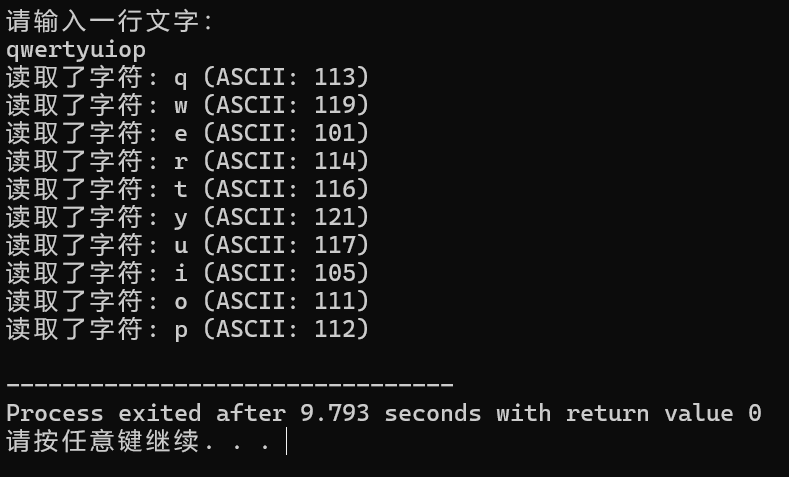 printf("读取了字符: %c (ASCII: %d)\n", c, c);