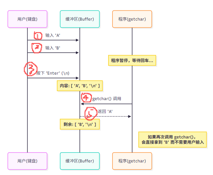 getchar()开始运行:到缓冲区里面,但是只拿走一个字符。getchar()一次只取一个字符。如果你输入了abc然后回车,缓冲区里面其实有4个东西:a,b,c,\n。第一个调用getchar()拿走了a,剩下的b,c,\n还在缓冲区里面排队,下一次调用会直接拿走b,不需要再敲键盘。