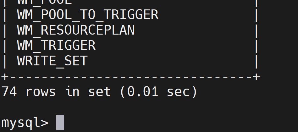 初始化成功后,会在MySQL的hive库中新建74张元数据管理的表