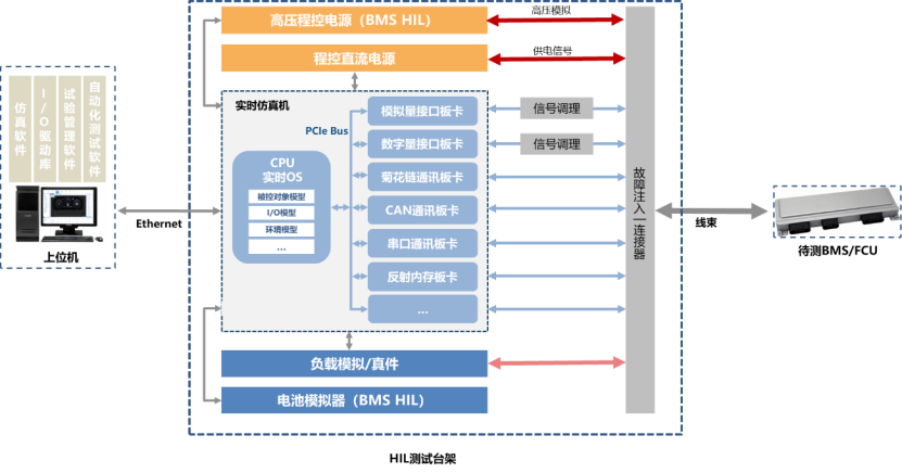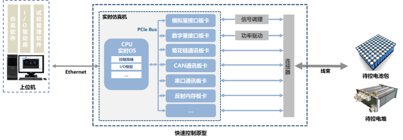 作为HIL台架的硬件核心,实时仿真机采用X86架构,CPU中加载实时操作系统,可实时计算电池包、电堆模型。通过PCIe总线拓展各种类型的I/O和总线板卡,可用于模拟传感器和执行器信号,连接真实控制器。板卡的种类和数量选择取决于待测控制器实际所需的接口。