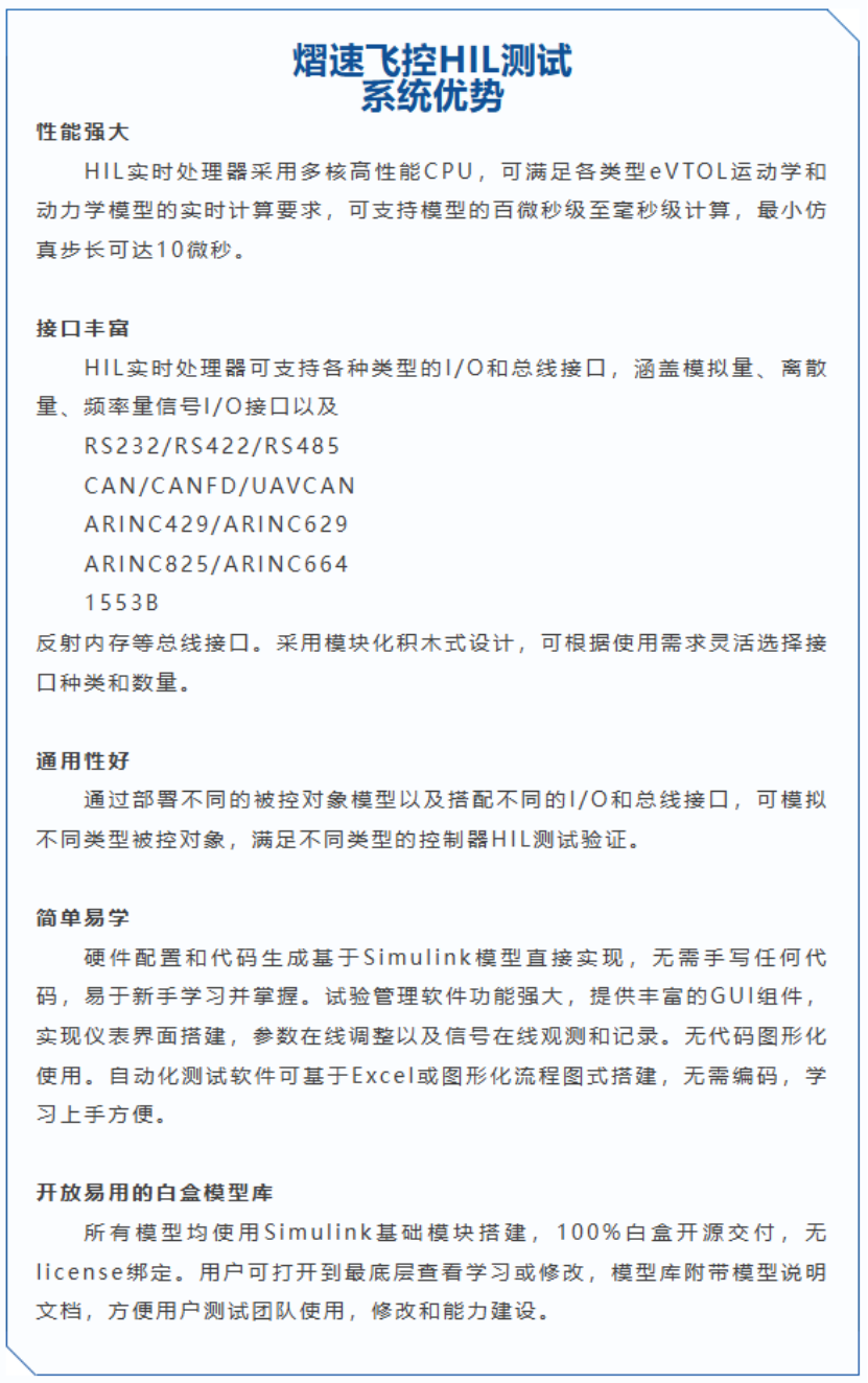 熠速可提供飞控系统控制器的快速控制原型开发和硬件在环仿真测试平台,可满足飞控系统的数字化实时仿真测试、半物理仿真测试以及多系统的联合仿真测试。