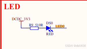 当 LED0 信号为低电平(如逻辑 0 / GND)时,电流自 3.3V → R9 → LED → LED0 流动,LED 点亮。