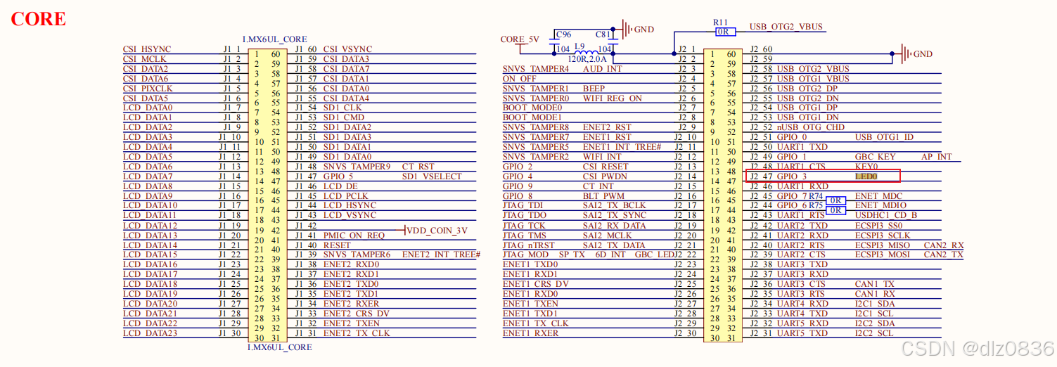 在 CORE 原理图(CPU 引脚页)中,存在一根标注为 GPIO_3 / LED0 的信号线(与 CPU 某个引脚相连),即 LED0 被直接连到 CPU 的一个可配置 IO(这里标称为 GPIO3)。