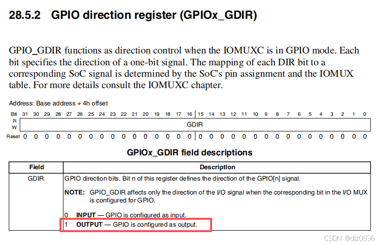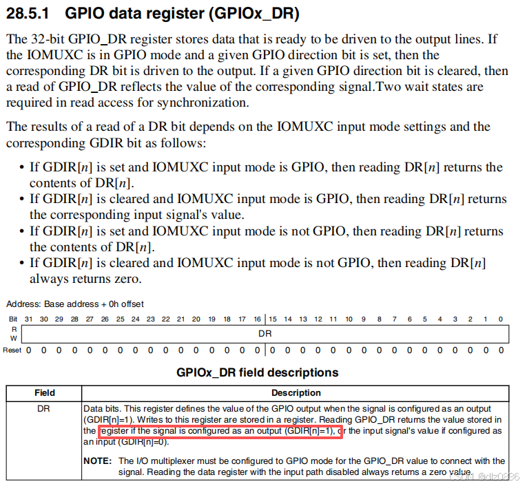 GPIOx_DR寄存器对应位可控制引脚输出电平; - 若 GDIR 配置为输入(0):