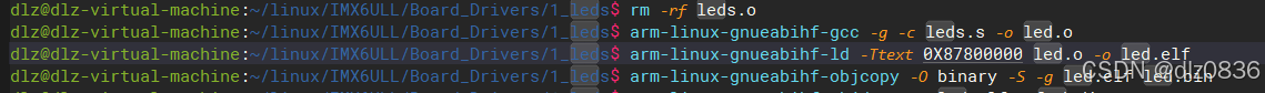 交叉编译器 arm-linux-gnueabihf-gcc 来编译。因为本试验就一个 led.s 源文件,所以编译比较简