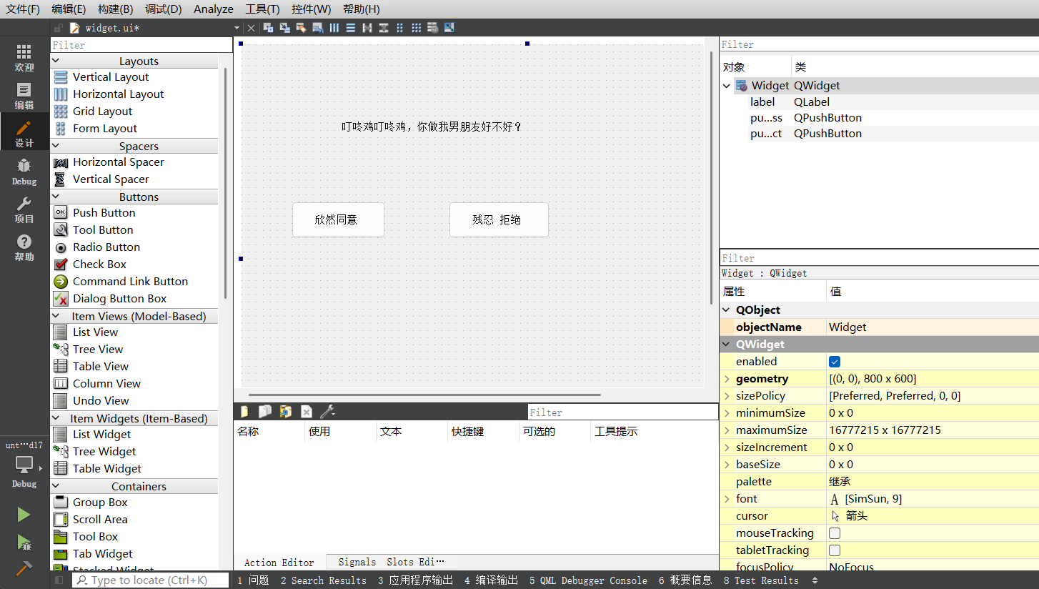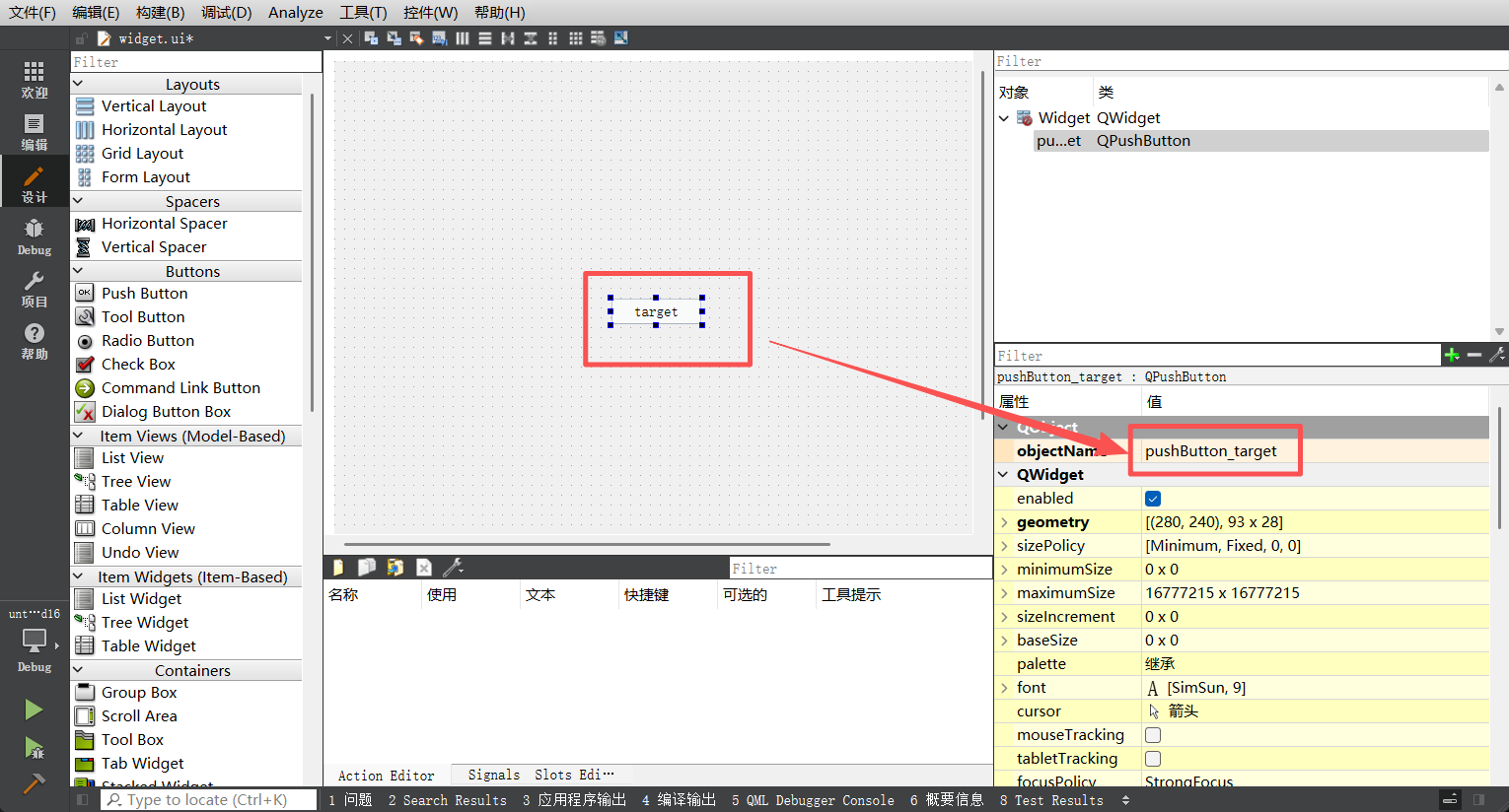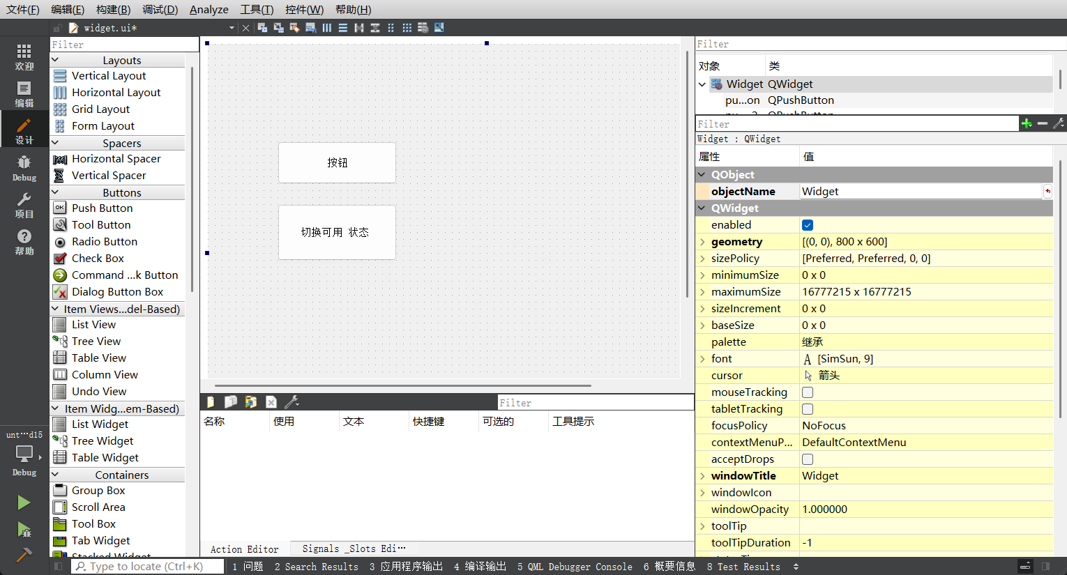 上图展示了 Qt Designer 中的属性编辑面板。开发者可以直接在界面右侧的属性栏中修改各个参数,包括控件的名称、坐标、尺寸、字体以及各种状态策略。这种可视化编辑方式极大地提高了 UI 开发效率,而其背后对应的则是 QWidget 类提供的 API 接口。