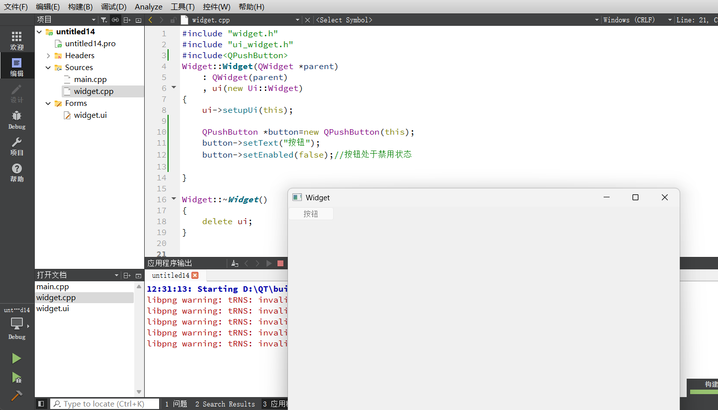 上图展示了一个通过代码创建并禁用的按钮示例。在 C++ 中,可以通过以下代码实现: