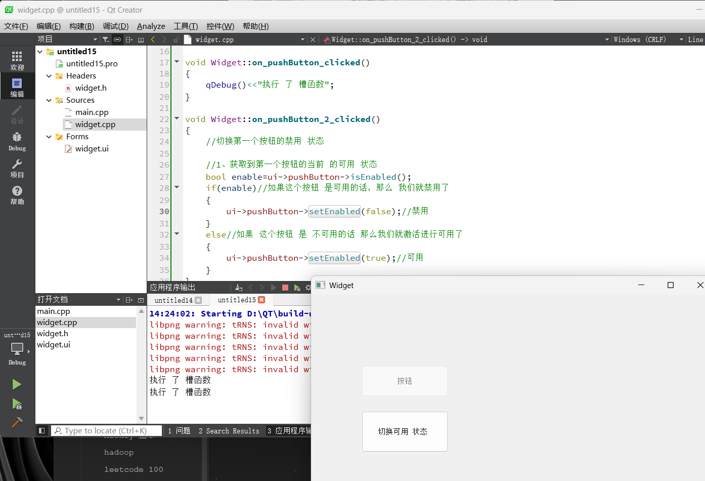 在第一个按钮的槽函数中,仅输出调试信息。如果按钮被禁用,此函数不会执行。