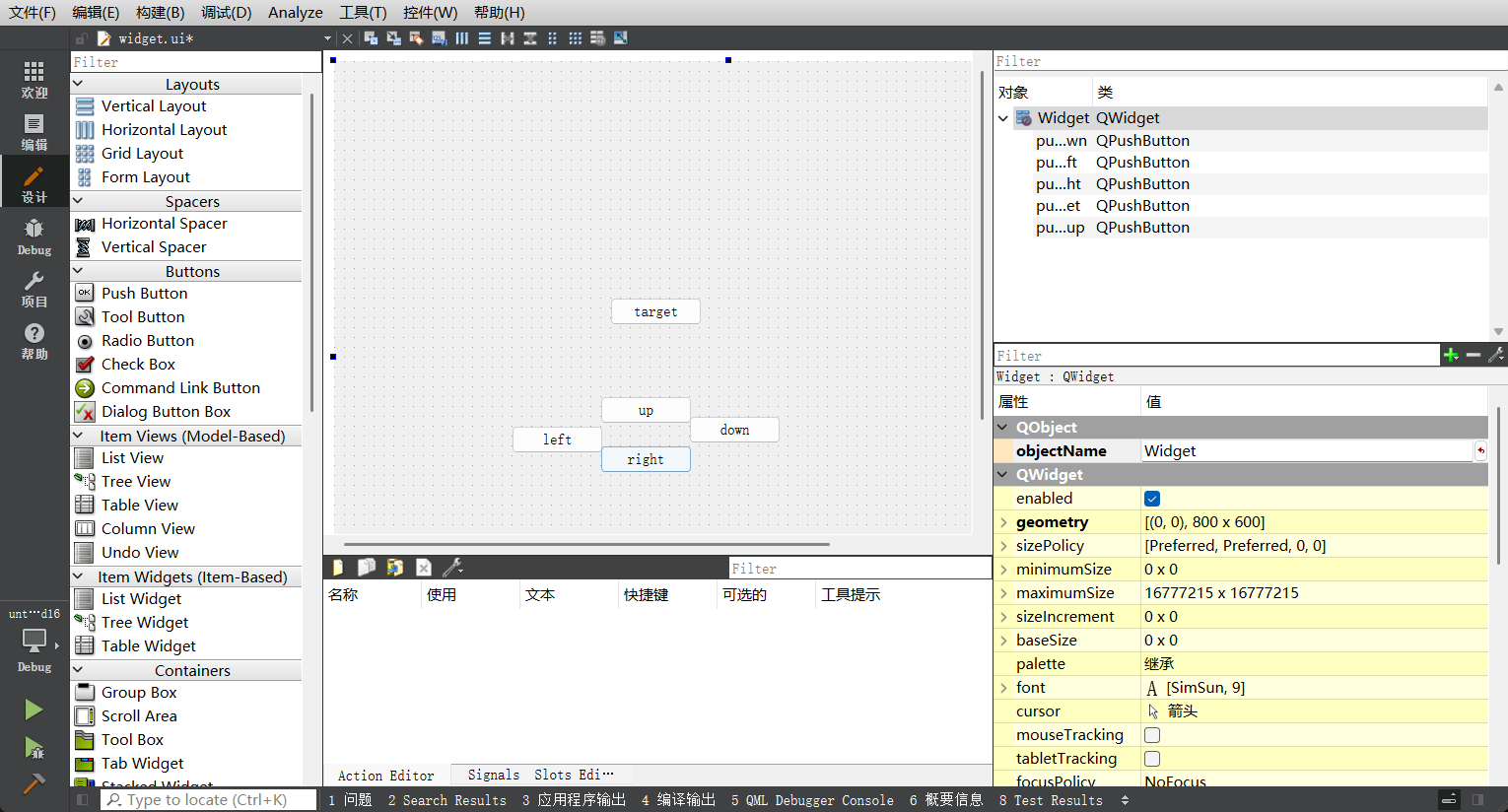 为了理解坐标系的操作,设计一个控制按钮移动的实验。界面包含一个目标按钮 pushButton_target 和四个方向控制按钮(上、下、左、右)。