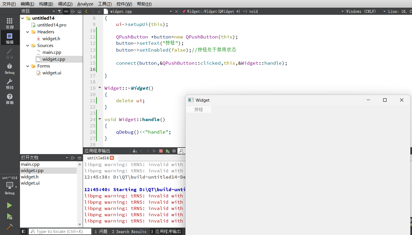 如上图所示,在 Qt Designer 中,可以通过 UI 属性直接勾选或取消 enabled。在逻辑复杂的业务场景中,通常需要动态切换控件状态。