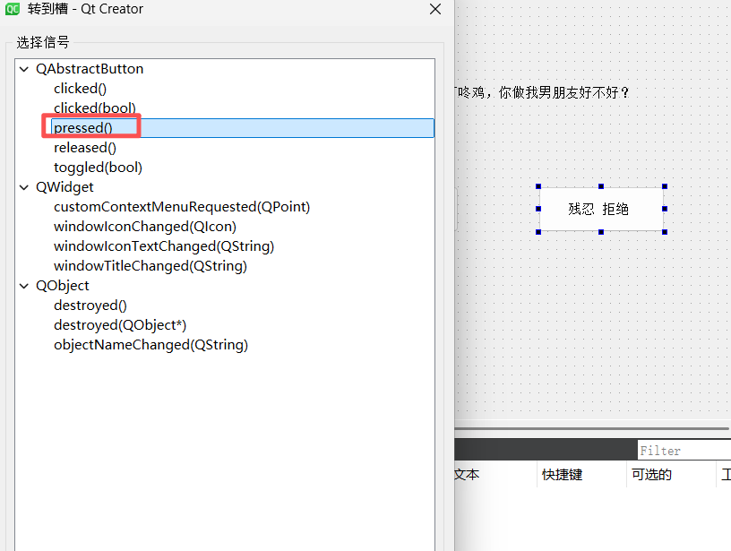 在 Qt Designer 中右键点击按钮,选择"转到槽",并选择 pressed() 信号。