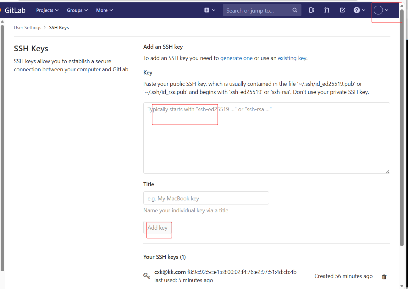 执行后会输出公钥文本,需将这段文本复制到 GitLab 的 "SSH 密钥" 配置中(GitLab→个人设置→SSH 密钥),完成本地与 GitLab 的 SSH 认证绑定。