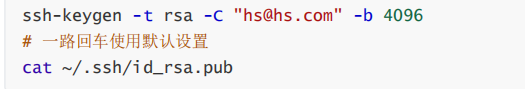- ssh-keygen -t rsa -C "hs@hs.com" -b 4096