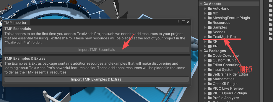 删掉assets下的TMP文件夹,接下来unity会弹出导入TMP的提示框,导入第一个就可以了。
